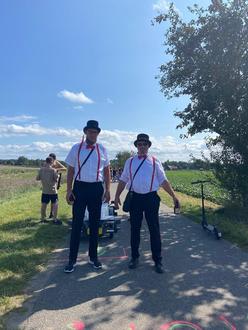 Die Faslamseltern Patrick Conrad (Vater) und Patrick Rademacher (Mutter) im Sommer beim 2. Seifenkistenrennen „Formel Faslam 2024“.