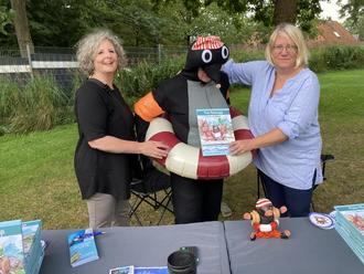 (v. l.) Alexandra Eicks und Sarah Essing stellten im Sommer Fiete Mullewapp und ihr Kinderbuch im Waldbad vor.