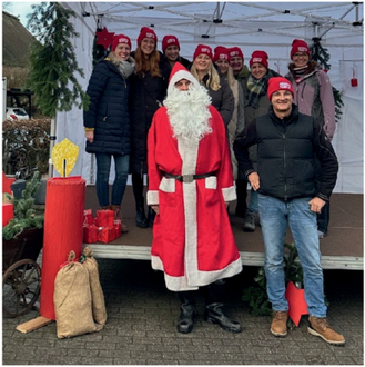 Das Marktteam freut sich mit dem Weihnachtsmann über die erfolgreiche Organisation. Nicht auf dem Foto: Melanie Ampts, Daniel Bentlage, Marion Lutz.