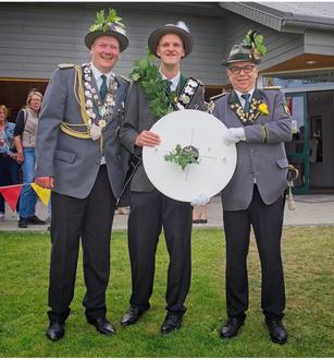 Proklamation 2024: König Marvin Sievers in der Mitte und links und rechts seine Adjutanten André Ehlbeck und der jetzt ehemalige Schützenoberst Hans-Peter Kröger