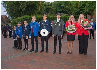 Minibester Noel Klatt (1. v. l.), Schülerbeste Ria Kutschke (3 v. l.), Jugendbester Niklas Horst (5 v. l.), Adjutant Oliver Knöbl, Damenbeste Kimberly Hauff, Audjutantin Carolin Putensen bei der Proklamation 2024.