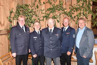 Hermann Dieck (Mitte) mit (v. li.): Gemeindebrandmeister Jörn Petersen, Ortsbrandmeister Gödenstorf/Oelstorf Thorsten Schöttner, Kreisbrandmeister Volker Bellmann, Samtgemeindebürgermeister Wolfgang Krause.
