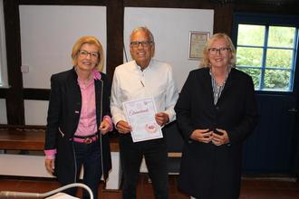 Christiane Oertzen und Barbara Frahm übereichten Heinrich Düver die Urkunde zur Ehrenmitgliedschaft.
