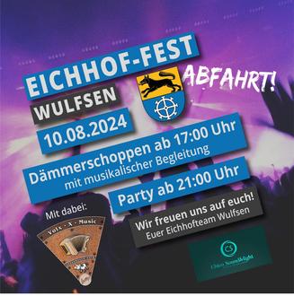 (ph). Wulfsen. Das traditionelle Eichhoffest in Wulfsen startet pünktlich wie immer am zweiten Samstag im August – das hat Tradition. Im anheimelnden Ambiente unter alten Eichen - im „Herzen von Wulfsen“ - geht’s bereits um 17.00 Uhr los mit dem Dämmerschoppen. Hier trifft man sich zum Klönen und Quatschen und unterhaltsamer Musik von Hartmut „Menne“ Mennerich und Peter „Pezi“ Goblitschke mit ihrem Akkordeon. Hier kommt auch die Generation auf ihre Kosten, die nicht mehr bei der abendlichen Sause dabei sein möchte. Ab 21.00 Uhr geht’s dann richtig los: Es spielt die Live Band „Volx-X-Music“ unterstützt durch DJ Chico Sound&Light der in den Pausen und ab 0 Uhr auflegt.