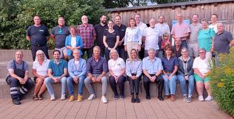Gruppenfoto vor dem Start der Nassen Nacht, mit Sponsoren, Veranstaltende und Vertreterinnen und Vertreter der Feuerwehr.