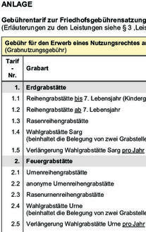 Die Bestattungsgebühr ist grundsätzlich zuzüglich der Grabnutzungsgebühr zu entrichten. In der Gebühr sind Haupt- sowie Nebenleistungen wie z.B. Bodenabfuhr, Nacharbeiten, Sicherheitsmaßnahmen bei Zweitbelegungen sowie Anfahrtskosten enthalten.