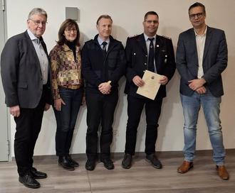 Von links: Samtgemeinderatsvorsitzender Karl-Bernd Wüstefeld, Fachbereichsleiterin 2 – Ordnung und Bürgerservice – Karin Wilde, Ortsbrandmeister Florian Kopp, stellv. Ortsbrandmeister Lars Lippenat, Samtgemeindebürgermeister Steffen Ahrenhold