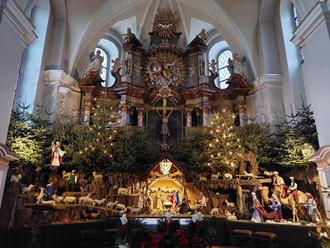 Die gestaltete Landschaft mit über 20 Nordmannstannen vor dem gesamten Hochaltar umgibt die weihnachtliche Szene und nimmt auf einer Fläche von über 45 m² die 60 Figuren ganz in sich auf. Fuchs und Käuzchen, Marder und Vögel aller Art tummeln sich - zwar nur ausgestopft - neben dem Getier aus Holz, den Schafen und Ziegen an der Weihnachtskrippe.