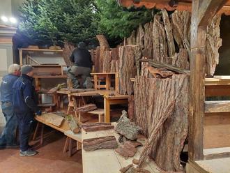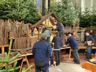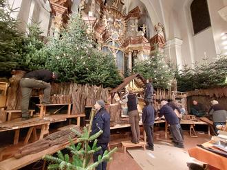 Die zeitaufwendigen Arbeiten für die eindrucksvolle Krippenlandschaft mit Wasserfall und Hügeln beginnen bereits am dritten Adventssonntag. Bevor der eigentliche Aufbau im Chorraum vor dem Hochaltar der Pfarrkirche beginnt, werden zunächst die Rückwände, durch die der kostbare Altar der Kirche geschützt wird, aufgestellt. Es wird dann die mehrstöckige und stabile Unterkonstruktion von den Krippenbauern errichtet und die elektrische Installation für Wasserfall und Beleuchtung verschiedener Einzelszenen sowie das glimmende Feuer eingebaut. Wenn alle Vorarbeiten abgeschlossen sind, werden die Holzplatten des Untergrunds mit einer Sandschicht kaschiert, bevor diese mit Borke, Moos, Steinen und Tannenzweige dekoriert werden.