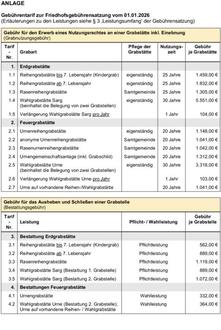 1. Gebühr für den Erwerb eines Nutzungsrechtes an einer Grabstätte inkl. Einebnung – Grabnutzungsgebühr (Gebührentarif-Nr.: 1.1 bis 2.7)