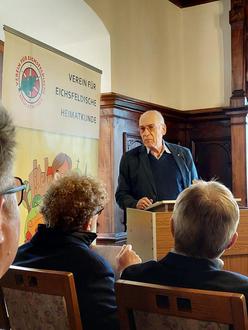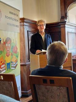 Peter Anhalt, Vorsitzender des VEH, verwies zudem auf einige Jubiläen: 2025 feierte der Heimatverein Goldene Mark sein 75-jähriges Bestehen, 2026 wird der VEH sein 120-jähriges Jubiläum begehen, vor 35 Jahren verzeichnete der VEH seine Neugründung (nach der Wiedervereinigung; die Vereinstätigkeit wurde bereits 1943 während der NS-Zeit eingestellt), Peter Anhalt selbst bekleidet seit 25 Jahren das Amt des Vorsitzenden, und besonderer Dank gelte zudem Torsten W. Müller, der seit 10 Jahren die Redaktion für das Eichsfeld-Jahrbuch leitet.