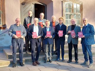 Die Autoren v.l.: Dr. Thomas T. Müller, Prof. Dr. Kurt Porkert, Gerold Wucherpfennig, Dr. Ulrich Hussong, Peter Anhalt, Prof. Dr. Jürgen Udolph, Dr. Torsten W. Müller, Josef Keppler und Verleger Helmut Mecke.