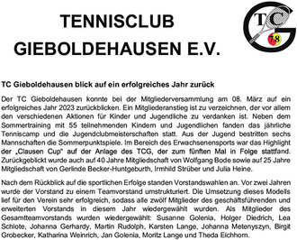Der TC Gieboldehausen konnte bei der Mitgliederversammlung am 08. März auf ein erfolgreiches Jahr 2023 zurückblicken. Ein Mitgliederanstieg ist zu verzeichnen, der vor allem den verschiedenen Aktionen für Kinder und Jugendliche zu verdanken ist. Neben dem Sommertraining mit 55 teilnehmenden Kindern und Jugendlichen fanden das jährliche Tenniscamp und die Jugendclubmeisterschaften statt. Aus der Jugend bestritten sechs Mannschaften die Sommerpunktspiele. Im Bereich des Erwachsenensports war das Highlight der „Clausen Cup“ auf der Anlage des TCG, der zum fünften Mal in Folge stattfand.
