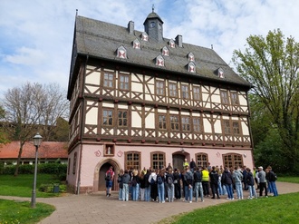 Zur offiziellen Eröffnung der Pilgertouren 2024 vor dem Schloss Gieboldehausen zeigte sich Bischof Heiner vom Auftaktstandort mit dem imposanten Schlossgebäude sehr beeindruckt. Er begrüßte hier zur ersten Pilgertour 2024 die Geistlichen, Propst Thomas Berkefeld aus Duderstadt, Pfarrer Matthias Kaminski aus Gieboldehausen, Diözesanjugendseelsorger & Pfarrer Matthias Rejnowski aus Hildesheim sowie den pastoralen Mitarbeiter Thomas Holzborn aus Duderstadt und den Referenten für religiöse Bildung im Bistum Hildesheim, Christopher Waide, der die alljährlichen Pilgertouren organisiert.