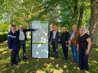 Über die Aufstellung freuen sich v.l.: Pfarrer Matthias Kaminski, HVE-Vorsitzender Gerold Wucherpfennig, Mitinitiator Alois Grobecker und die Vertreter der Kirchorte der Pfarrgemeinde St. Laurentius, Bernd Neugebauer (Gieboldehausen), Klaus Hawner (Bodensee) und Elisabeth Bodmann (Wollbrandshausen).