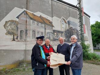Die Zeitzeugen Karl Hohlfeld mit Dienstmütze seines Vaters, Herbert Nolte, Werner Grobecker und Ortsheimatpfleger Alois Grobecker haben am ehemaligen Standort des Bahnhofes zum 50. Jahrestag der Einstellung des Personenbahnverkehrs (25. Mai 1974) persönliche Erinnerungen ausgetauscht.