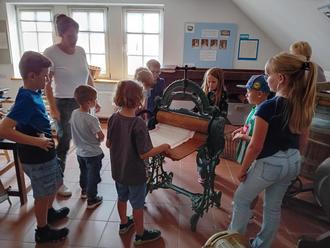 Bei einer Entdeckungsreise durch die Hauswirtschaftsabteilung im Museum konnten die Kinder sehen, wie und womit die Wäsche vor ca. 100 Jahren gewaschen wurde. Anschließend konnten sie an einer alten Mangel ausprobieren, wie sie geglättet wurde.