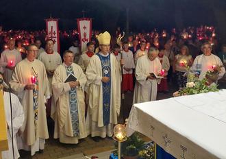 Dem Gottesdienst schloss sich die stimmungsvolle große Lichterprozession an. Mittlerweile war die Dämmerung hereingebrochen. Die Christen entzündeten ihre weißen Kerzen mit dem roten Windschutz.