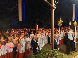 Wollbrandshausen. Besser hätten die Bedingungen für das Hochfest Mariä Himmelfahrt nicht sein können. Bei strahlendem Sonnenschein und angenehmen Sommertemperaturen haben sich rund 1.200 Gläubige traditionsgemäß am 15. August 2024 auf den Weg zum Höherberg gemacht, um mit Bischof Dr. Heiner Wilmer SCJ das Hochfest der „Aufnahme des Leibes und Seele Mariens in den Himmel“ mit Kräutersegnung und großer Lichterprozession zu feiern.