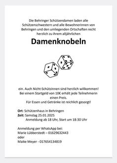 | 18:00 Uhr | Damenknobeln der Behringer Schützendamen, auch Nicht-Schützinnen sind willkommen, im Behringer Schützenhaus, Anmeldung Tel.: 0162 9632443 oder 0176 54134819 |