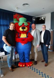 Firmengründer Robert Dahl, Maskottchen Karlchen, Bürgermeister Dr. Jens Bülthuis und René Meyer, stellvertretender Geschäftsführer der Wirtschaftsfördergesellschaft (WLH) im Landkreis Harburg.