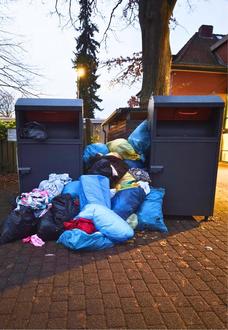 So bitte nicht! Wer Kleidung neben die Container stellt, riskiert ein Bußgeld.