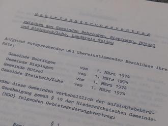 Am 04. März 1974 schlossen die Gemeinden Behringen, Bispingen, Hützel und Steinbeck einen Gebietsänderungsvertrag ab. Dieser enthielt alle wichtigen Regelungen für die Gestaltung der künftigen Gemeinde, von Rechtsnachfolge bis hin zu Ortsrecht und der Bestellung von Ortsvorstehern.