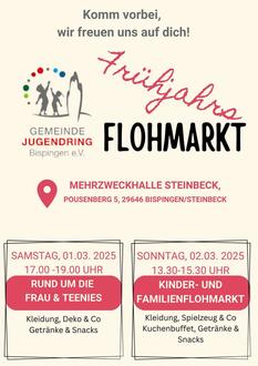 | 17:00 bis 19:00 Uhr | Frühjahrs-Flohmarkt „Rund um die Frau & Teenies“, in der Mehrzweckhalle Steinbeck, Pousenberg 5 |