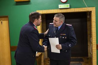 Kreisbrandmeister Matthias Meyer überbrachte die Grüße der Kreisfeuerwehr und hatte noch zwei Glaspokale anlässlich des 100-jährigen Jubiläums im vergangenen Jahr vom Heidekreis und dem Land Niedersachsen dabei. Darüber hinaus hatte er eine weitere Ehrung dabei. In gewohnter Weise verlas er zuerst die Vita und die Verdienste der zu ehrenden Person, bevor schließlich am Ende der Name genannt wurde. Sichtlich überrascht, seinen Namen zu hören, erhob sich Ortsbrandmeister Thorben Röhrs und freute sich sehr über das Feuerwehr-Ehrenzeichen des Landesfeuerwehrverband Niedersachsen in Bronze.