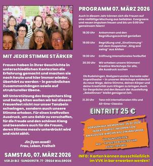 Auch im Heidekreis findet am 07. März anlässlich des Weltfrauentags unter dem Motto "Mit jeder Stimme stärker" wieder das Internationale Frauenfest in Walsrode statt. Karten sind für 25 Euro über die Tourist-Information Walsrode erhältlich.