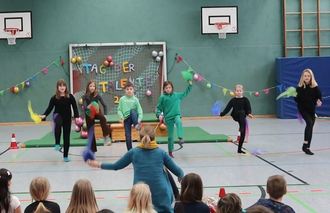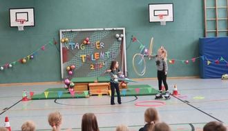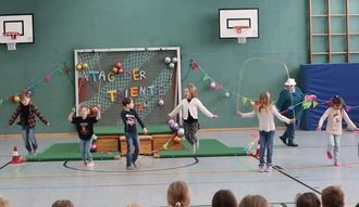 Schüler*innen der ersten und dritten Klassen präsentierten ihre Talente im Rahmen einer großen Show für die ganze Grundschule in der Sporthalle. Es wurde Seil gesprungen, mit Tüchern jongliert und gesungen, es wurden selbstgeschriebene Gedichte und Geschichten vorgelesen, Witze erzählt und Fußballtricks vorgeführt. Es gab auch eine Hobby Horse-Vorführung und Hula Hoop-Künstlerinnen.