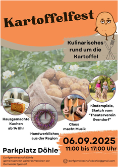 Bis jetzt. Denn nun hat die Döhler Dorfgemeinschaft den Faden wieder aufgenommen. Gemäß der bisherigen Tradition wird das Kartoffelfest am ersten Septemberwochenende stattfinden, dieses Mal jedoch auf dem neu gestalteten Parkplatz in Döhle. Dabei geht es vor allem darum, gemeinsam und ortsübergreifend mit den lokalen Vereinen und Gastronomen etwas auf die Beine zu stellen und die Menschen vor Ort zusammen zu bringen.