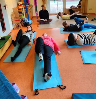 An Tag zwei stand vor allem die praktische Umsetzung im Alltag der Betreuung auf dem Programm. Die Durchführung sollte sowohl für den Waldkindergarten, als auch in der Schulkinderbetreuung und in der Kita in Hützel in der täglichen Arbeit, ohne viel Aufwand, möglich gemacht werden. Hier wurden Spielräume eruiert und diskutiert. Im Verlauf des Studientages ging es dann auch mit ganz praktischen Turnübungen für das Personal zur Sache; denn was den Kindern nahe gebracht werden soll, müssen auch Erwachsene erst testen. Mit Freude an der Bewegung konnten alle Mitarbeiter*innen erfahren, wie es um die eigene Integration der Reflexe bestellt ist. Hier gab es allerhand Aha-Momente und Gesprächsstoff.