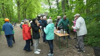 Bei strahlender Sonne führte die Strecke durch den Wald südlich von Hambühren nach Wietzenbruch in die Nähe des Naturfreundehauses Waldschmiede. Dort wurde auf einem Waldweg eine Pause eingelegt, bei der sich die Fahrradfahrer mit Getränken und Keksen für die Weiterfahrt zum Grundstück der evangelischen Kirche stärken konnten.