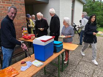 Hier hatten etliche andere Mitglieder schon von den leckeren Kuchenspenden gekostet und freuten sich, dass die Radler nach einer Strecke von 24 km gut gelaunt und hungrig dazu stießen. Inzwischen war auch der Grill einsatzbreit und Würstchen, Steaks fanden zahlreiche Abnehmer. Auch die gespendeten Salate wurden begeistert gekostet.