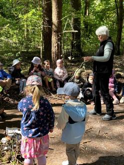 An einem Dienstagmorgen sind wir nach dem Frühstück gemeinsam mit den Großeltern zu unserem Waldplatz gelaufen. Im Gepäck hatten wir natürlich wie immer unseren Bollerwage mit Schaufeln, Besen, Lupenbechern und vielem mehr, aber auch die Großeltern hatten etwas mitgebracht. Einen geheimnisvollen Beutel. Um zu erfahren was dort drin war mussten wir erst einmal auf dem Waldsofa Platz nehmen. Dann hieß es leise sein und gut zuhören und auch zuschauen. Aus dem Beutel wurden dann ein Waldmobile und ein Traumfänger rausgeholt.