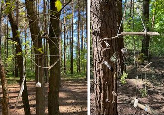 Danach haben die Großeltern viele verschiedene Gegenstände aus dem Beutel geholt. Es waren alles Naturmaterialien wie Moos, Holz, Zapfen und Federn. Und dann hieß es wir fangen an Mobiles zu bauen. Dazu haben die Igelkinder noch weitere Materialien im Wald gesucht und auf einem Sammelplatz abgelegt. Dann wurde gemeinsam entschieden welchen Ast wir nehmen wollen um mit den Mobiles zu beginnen und dann ging es endlich los. Mehrere Bindfäden wurden abgeschnitten und es ging es ans wickeln. Zuerst wurden die Fäden am Ast befestigt und nach und nach kamen die verschiedenen Naturmaterialien daran. Es entstanden viele tolle und wunderschöne Mobiles die zum Schluss beim Waldsofa an die Bäume gehangen wurde.