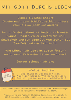 | Gesprächskreis: | Mittwoch, einmal im Monat um 20.00 Uhr im Gemeindesaal. Nächstes Treffen: 18. Juni 2025 |