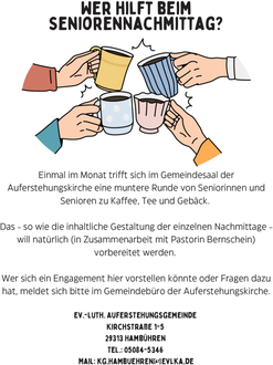 Seniorennachmittag: Montag, alle vier Wochen, 15.00 Uhr im Gemeindesaal