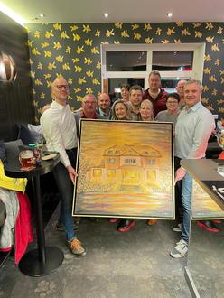 Zur vorgerückten Stunde wurden die noch verbliebenden Gäste zur Verkostung in die Bar „Goldfinger“ eingeladen. Wie sich dann später herausstellte, war die Formulierung von Guido Schulze ernst gemeint und wir waren eingeladen. Diese Geste wollten wir, als Vertreter einzelner Vereine/Verbände, nicht einfach so hinnehmen. Und so entstand die Idee, der Heideblüte etwas Besonderes zukommen zu lassen. Bereits nach kurzer Überlegung eines überschaubaren Gremiums wurde beschlossen, dass die Heideblüte von uns eine bleibende Erinnerung in Form eines Gemäldes bekommen soll. Jetzt bedurfte es aber noch die Künstlerin, welche das Gemälde malen sollte, von unserer Idee zu überzeugen. Die Künstlerin fand die Idee herausfordernd und sagte zu. Sowohl die Größe des Gemäldes als auch ein paar knifflige Strukturen hatten doch einige Zeit in Anspruch genommen, so dass das Gemälde erst kurz vor Weihnachten in einem ebenfalls feierlichen Rahmen im „Goldfinger“ übergeben werden konnte. Guido Schulze und Roger Borkowski waren sichtlich angetan von dieser Übergabe und auch wir hatten an diesem Abend unsere Freude. Danke sagen wir der Künstlerin Christine Witting aus Hambühren für dieses sehr authentische Gemälde der Heideblüte, welches bereits einen ganz besonderen Platz in der Heideblüte (von dem Weg des Restaurants zum Saal gefunden) hat. Wir freuen uns auf das nächste Event der Vereine/Verbände, wenn es dann heißt: Nacht der Vereine am Samstag, 16.03.2024 in der Heideblüte Hambühren.