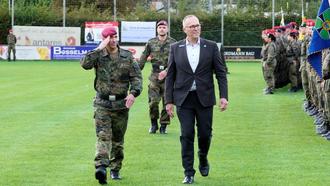 Der Bürgermeister Hambührens, Carsten Kranz, und der Kommandeur der Lehrgruppe D, Oberstleutnant Tim Holzapfel, schreiten gemeinsam die Front ab.