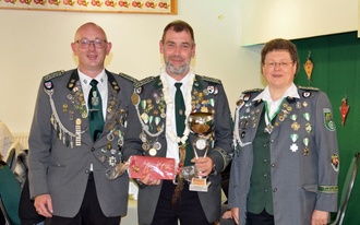 Schweineschwänzchenkönig Lars Schwerdtfeger (mitte) mit der 1. Schießsportleiterin Anja Mundt (re.) und dem stellvertretenden Schießsportleiter Jens Mönnich (re).
