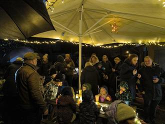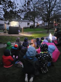 Dann war endlich der besondere Tag da. Als es abends dunkel wurde trafen sich die Bienenkinder mit ihren Familien am Kindergarten und stimmten sich mit einem Laternenlied auf das Fest ein. Auf dem Außengelände erwartete dann alle eine kleine Theaterkulisse und es gab die Geschichte von der kleinen Feldmaus Frederick zu sehen.