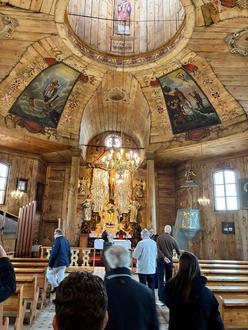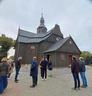Es folgte ein Spaziergang durch Buk über den so genannten Touristenpfad. Der Direktor der öffentlichen Bibliothek und des Kinos von Wielkopolska, Hubert Wejmann, teilte mit uns sein Wissen über die örtlichen Denkmäler und sprach auch über die kulturellen Verbindungen zwischen Buk und der europäischen Kultur insgesamt. Die Führung durch die historischen Orte der Gemeinde begann mit dem Heiligtum der „Lieben Frau von Bukowska Literacka“, dann wurden die „Kirche des Heiligen Kreuzes“, der „Stanisław-Reszko-Platz“ und der Marktplatz, das Versammlungszentrum – die ehemalige jüdische Synagoge – besucht.