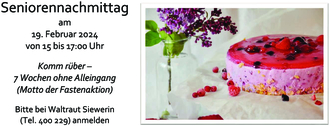 Seniorennachmittag: Montag, alle vier Wochen, 15.00 Uhr im Gemeindesaal