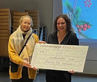 Der Gewinnerscheck wurde am letzten Schultag des Jahres 2023 beim gemeinsamen Singen vor der gesamten Schulgemeinschaft von der 1. Vorsitzenden des Förderkreises an die Klassenlehrerin der Gewinnerklasse überreicht.