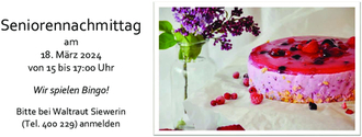 Seniorennachmittag: Montag, alle vier Wochen, 15.00 Uhr im Gemeindesaal. Nächstes Treffen: 18. März 2024.