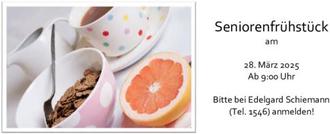Seniorenfrühstück: Freitag, alle vier Wochen, 9.00 Uhr im Gemeindesaal