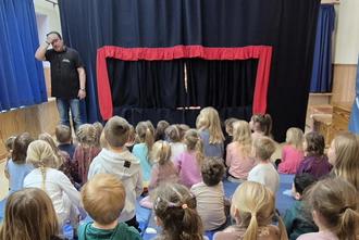 Die Obertaler Marionettenbühne war, dank der finanziellen Unterstützung des Fördervereins, endlich wieder bei uns im Kindergarten. Am 11. März 2026 verwandelten Michael Richter, der schon zu einem festen Bestandteil unseres Kita-Jahrs geworden ist, und seine Marionetten den Bewegungsraum der Kita Mittelstraße in einen riesigen Theatersaal für fast 50 Kinder.