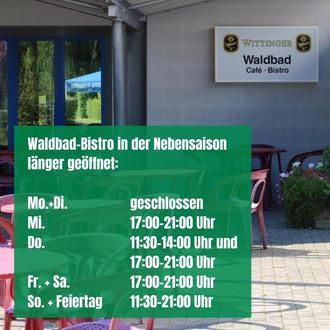 Der Gastraum des Bistros am Waldbad bietet auch in den kälteren Monaten eine gemütliche Atmosphäre. Die Öffnungszeiten nach der Badesaison, also in der Nebensaison, lauten: mittwochs 17:00-21:00 Uhr, donnerstags 11:30-14:00 Uhr und 17:00-21:00 Uhr, freitags und samstags 17:00-21:00 Uhr, sonntags und feiertags 11:30-21:00 Uhr. Montags und dienstags ist geschlossen. Bestellungen und Reservierungen nimmt Familie Jahns unter Tel. 05832-720216 entgegen.